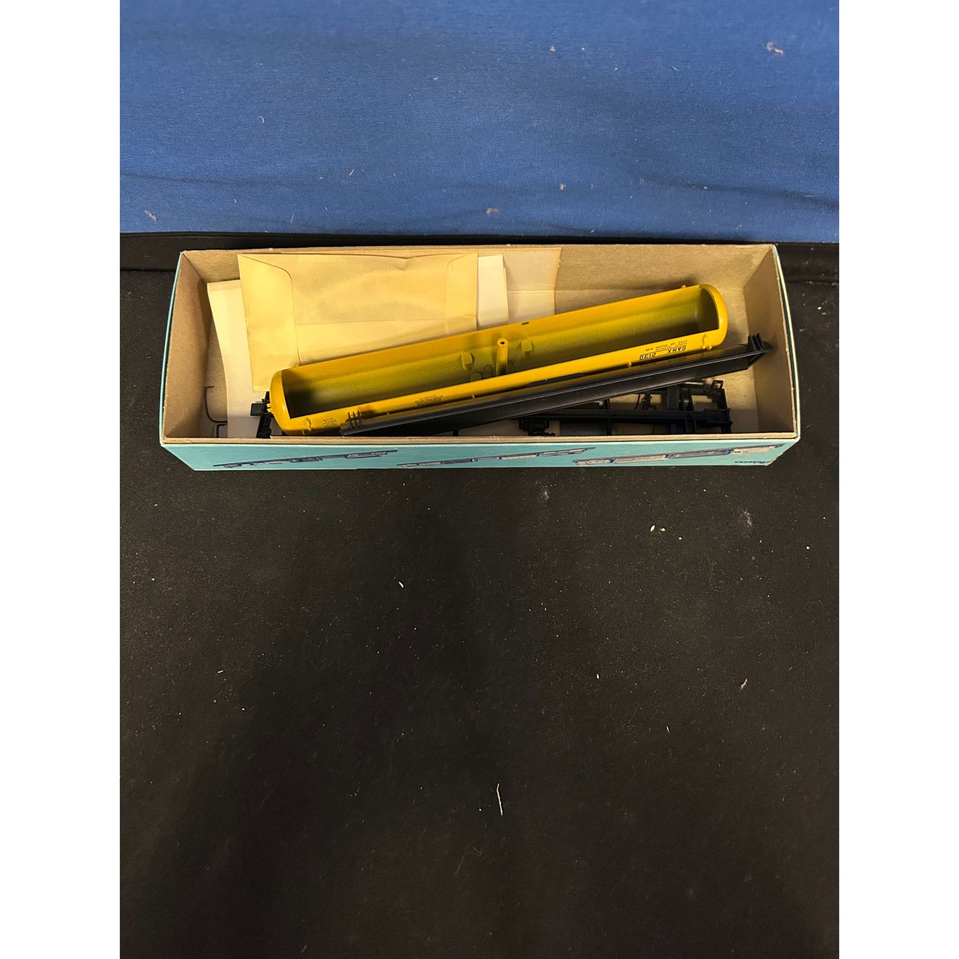 Detailed HO scale model train kit with authentic railroad blueprint scaling. Includes a yellow tank car for realistic train setups.