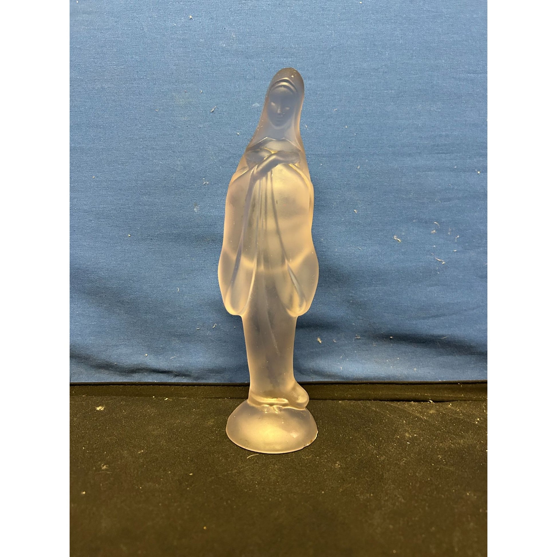 This frosted glass Virgin Mary figurine serves as a spiritual accent for home decor or religious collections. Its frosted texture adds a serene and elegant look.