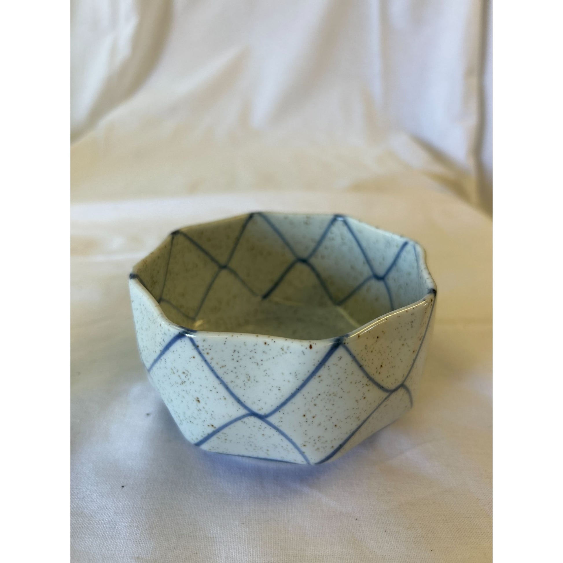This handcrafted octagonal ceramic bowl features a subtle blue diamond pattern and speckled detailing, suitable for serving snacks or as decor.