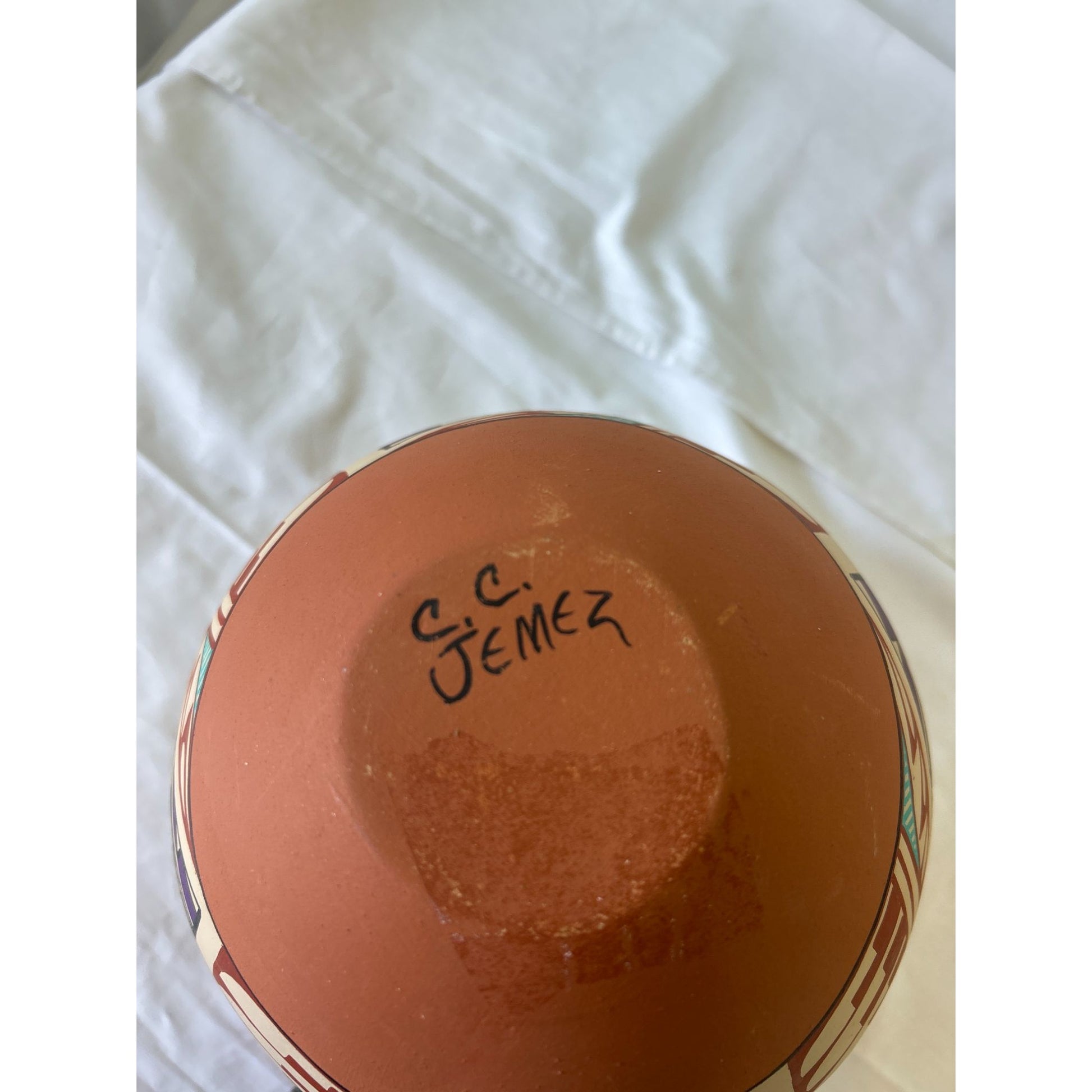 This handcrafted terracotta vase by G.C. Jemez features intricate Native American geometric patterns in vibrant multicolor tones, blending tradition and artistry.