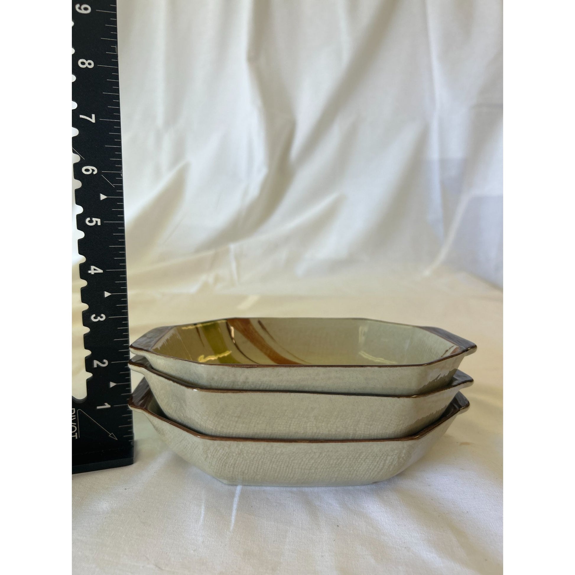 Set Of 3 Vintage Ceramic Hexagonal Bowls Beige & Brown Glaze 6" Diameter Unique Design