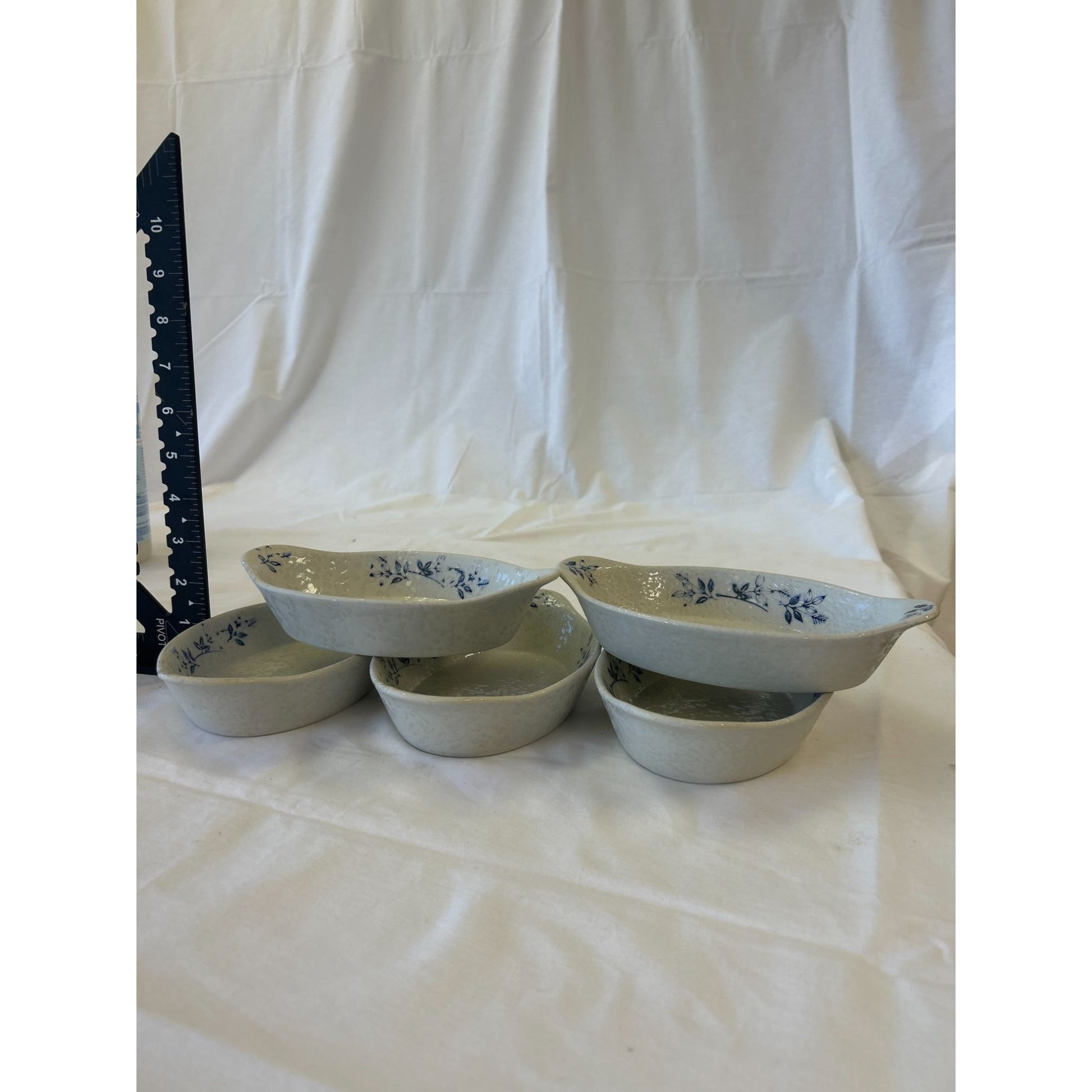 Set Of 5 Vintage Gray Oval Ceramic Bowls With Blue Floral Design