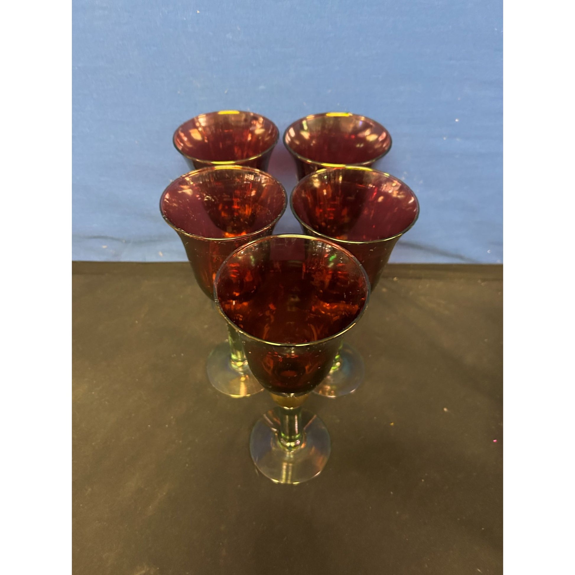Set Of 5 Vintage Red & Green Glass Goblets With Gold Accents