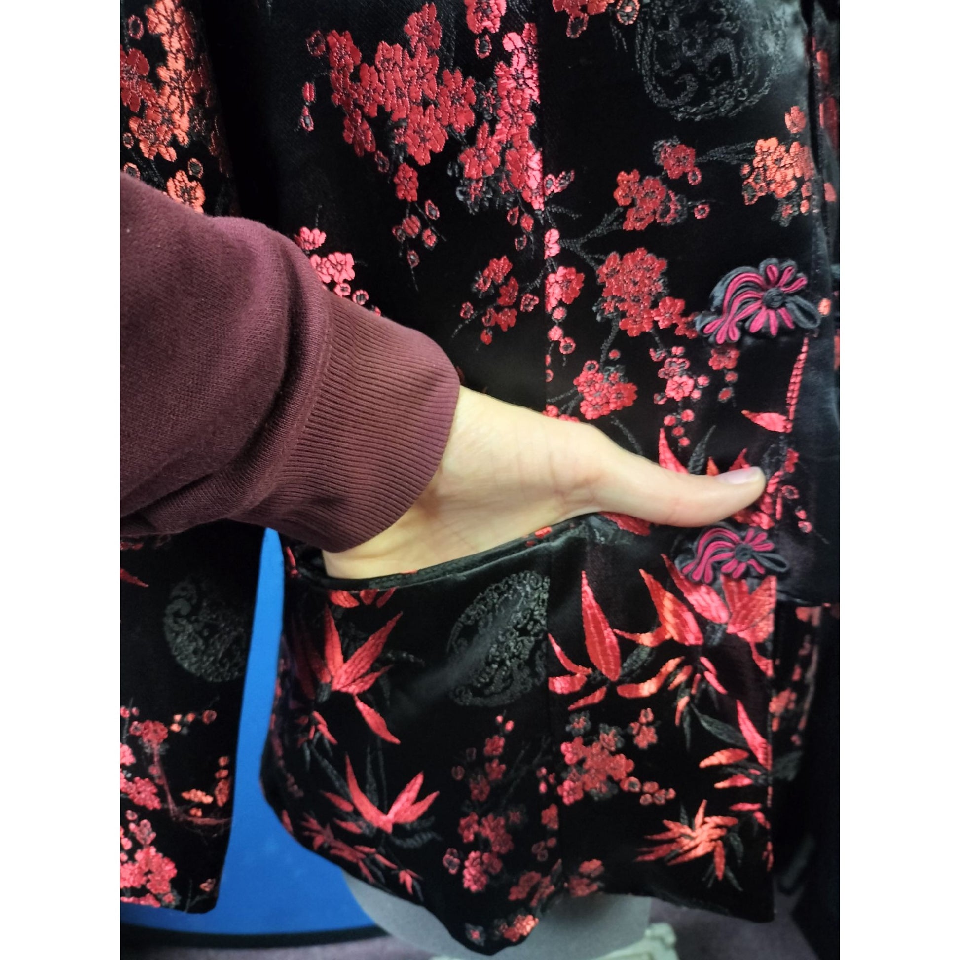 This elegant jacket features intricate floral patterns on luxurious satin, frog-style closures, and functional pockets. A stylish addition to any wardrobe.