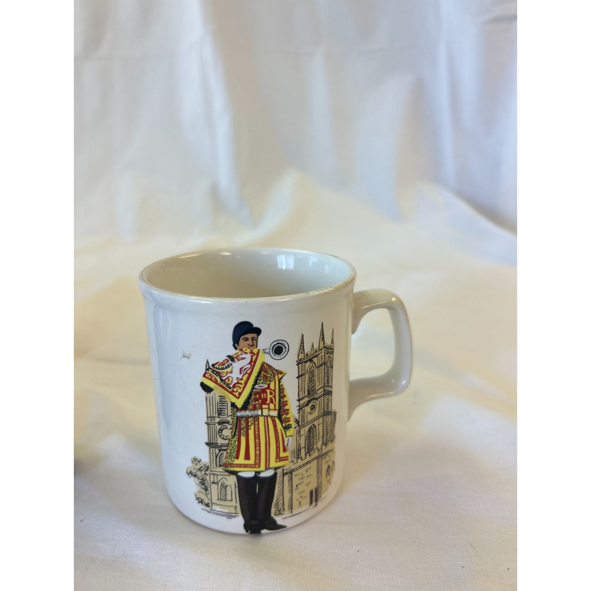 A charming vintage ceramic mug featuring a Beefeater and Westminster Abbey illustration. Ideal for collectors or as a unique display piece.