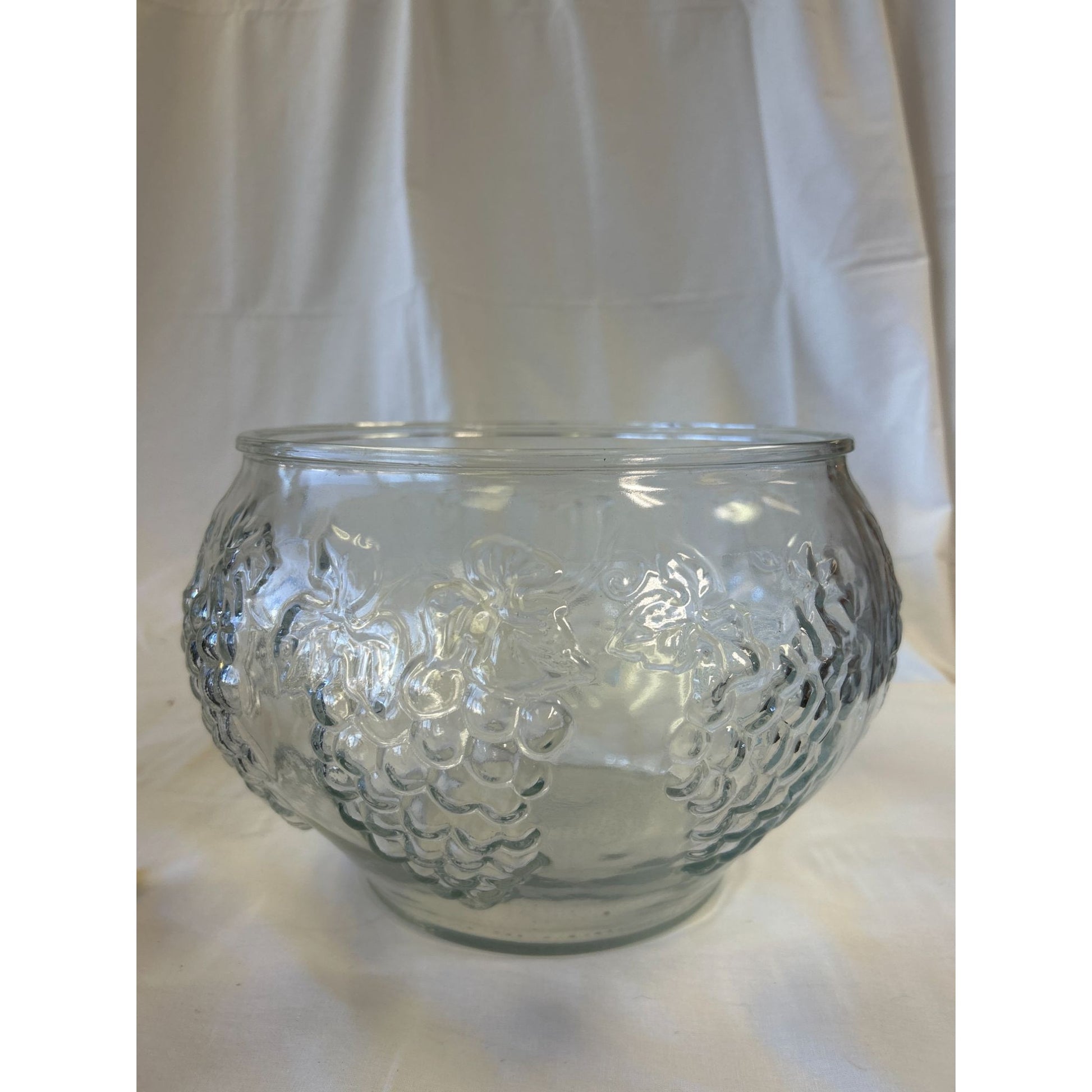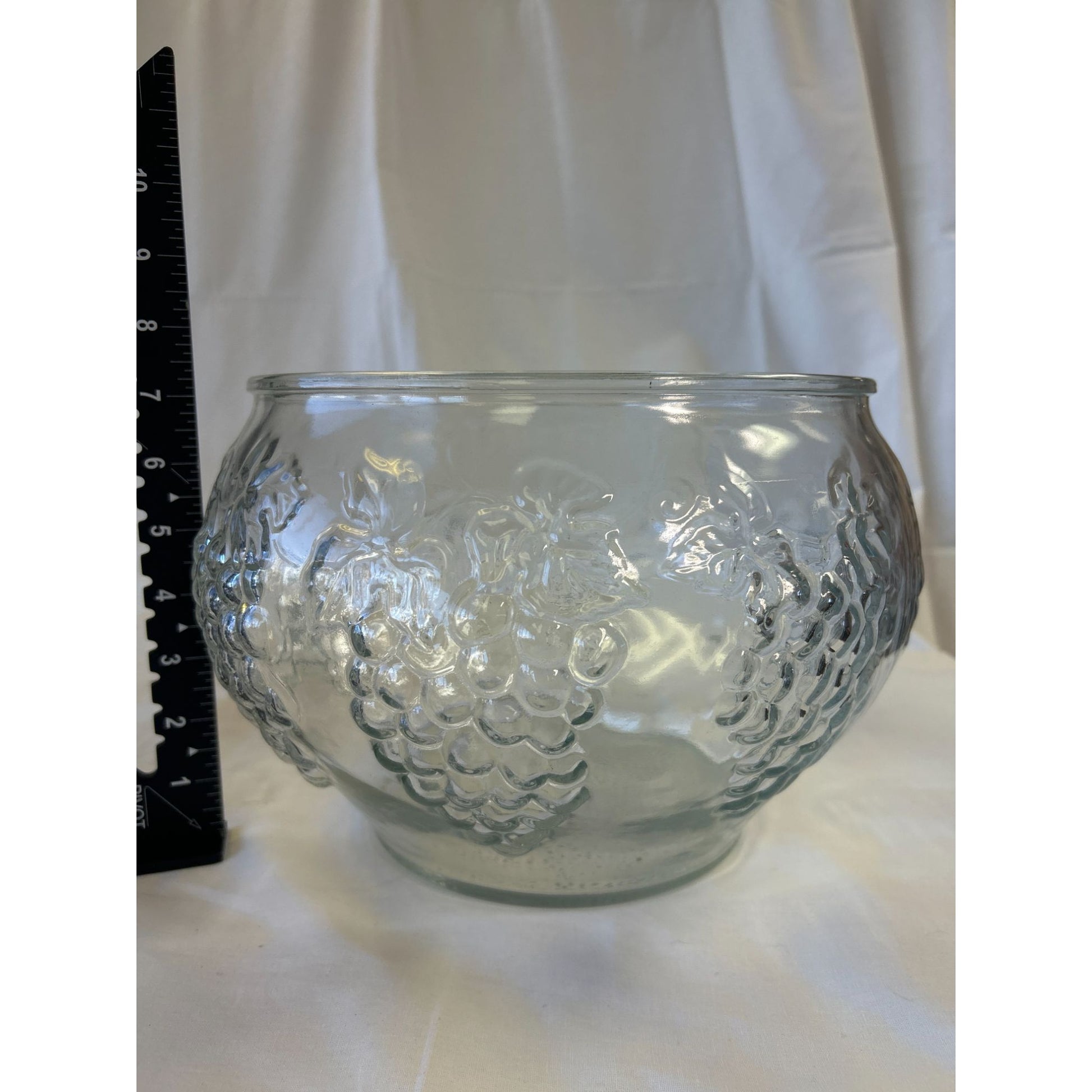 A timeless embossed glass bowl showcasing grape and vine patterns. Ideal for decorative or practical use, adding elegance to any setting.