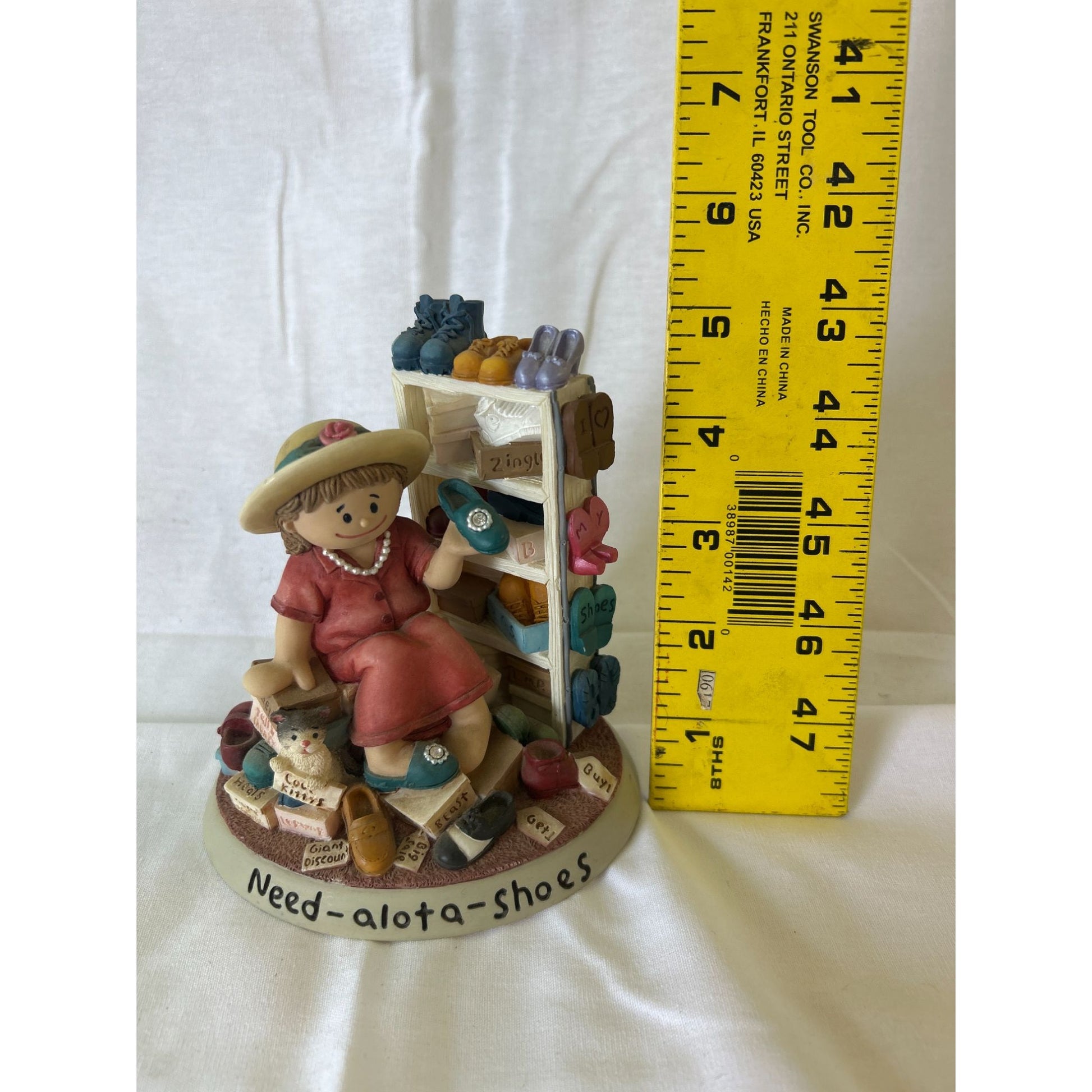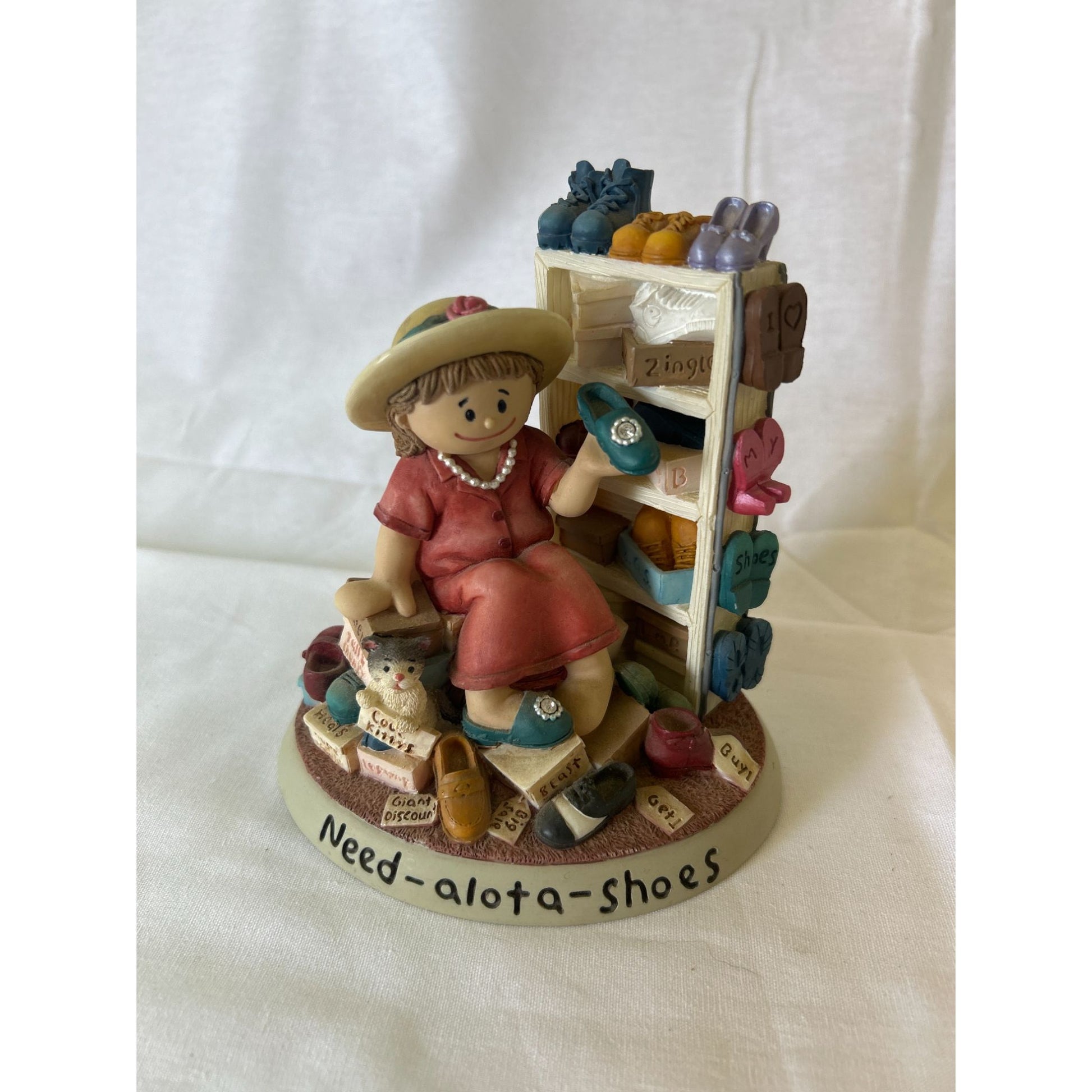 This figurine depicts a whimsical woman surrounded by shoes, capturing a lighthearted charm. Ideal for collectors or unique home decor.