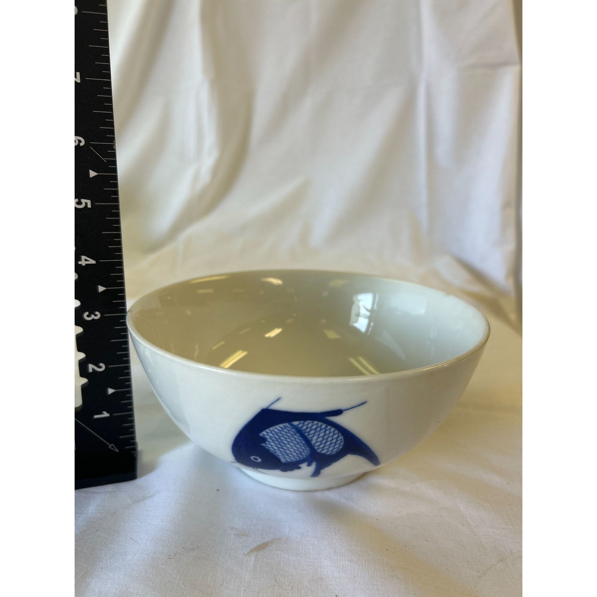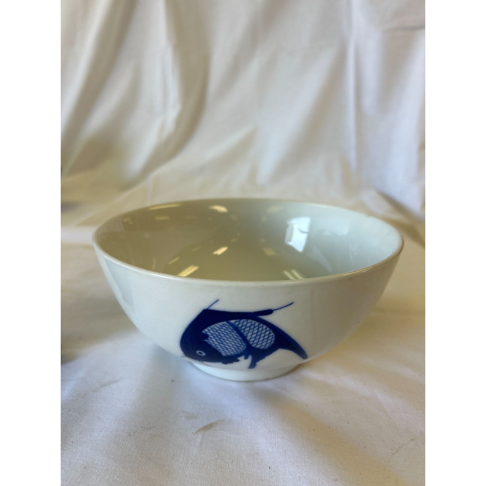 Vintage White Ceramic Bowl With Blue Koi Fish Design 5" Diameter